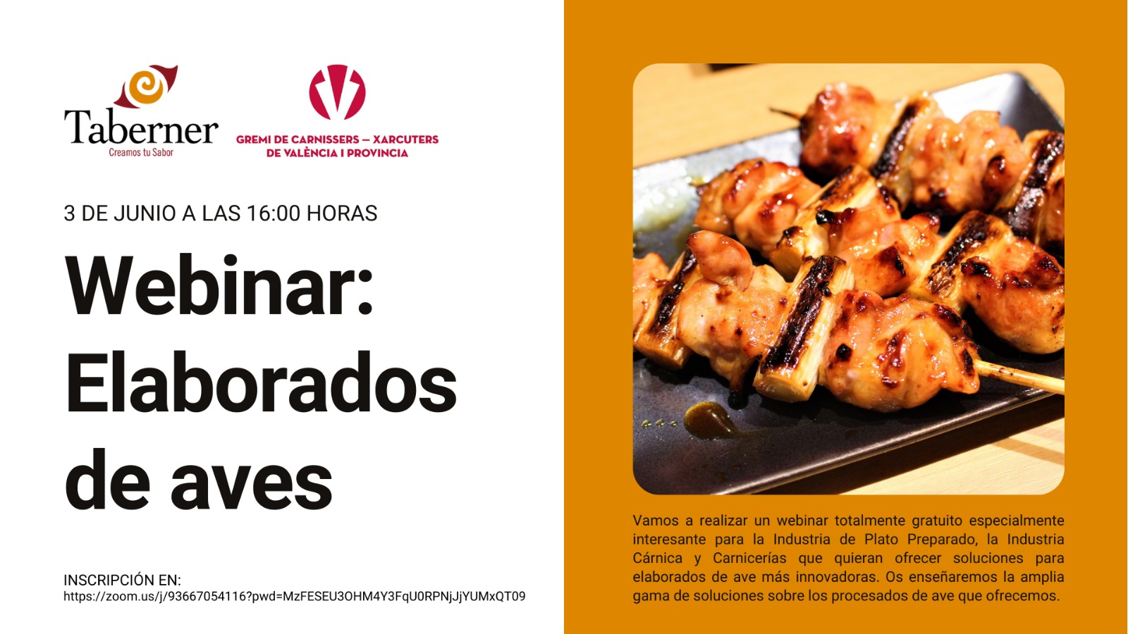 El Gremio de Carniceros de Valencia va a realizar un webinar totalmente GRATUITO, especialmente interesante para la Industria de Plato Preparado, la Industria Cárnica y Carnicerías que quieran ofrecer soluciones para elaborados de ave más innovadoras. Os enseñaremos la amplia gama de soluciones sobre los procesados de ave que ofrecemos.