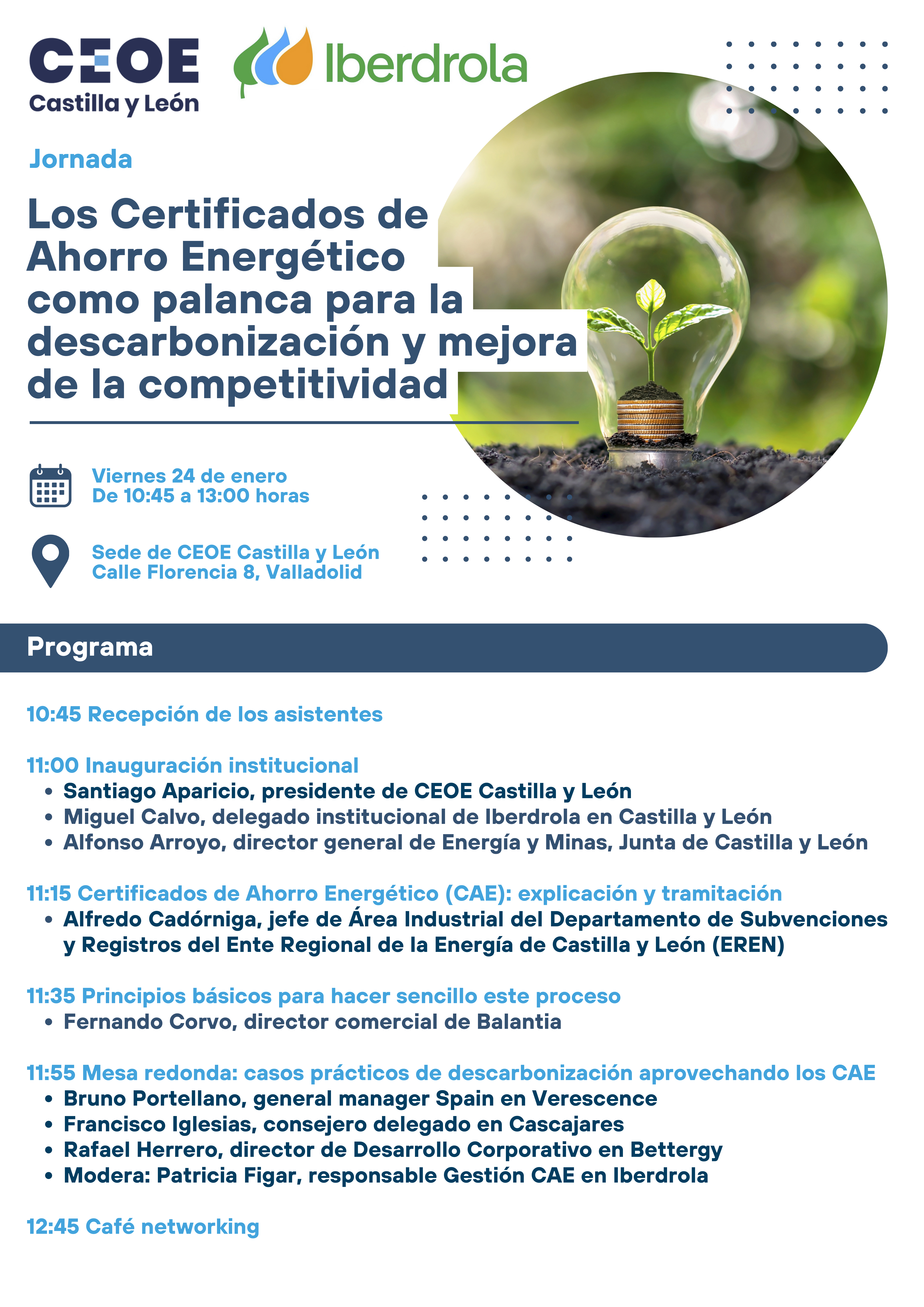 CEOE Castilla y León e Iberdrola organizan la jornada "Los Certificados de Ahorro Energético como palanca para la descarbonización y mejora de la competitividad", que tendrá lugar el viernes 24 de enero en Valladolid, en la cual diferentes expertos analizarán todos los aspectos de este mecanismo que permite a las empresas conseguir importantes ahorros aplicando medidas de eficiencia energética.