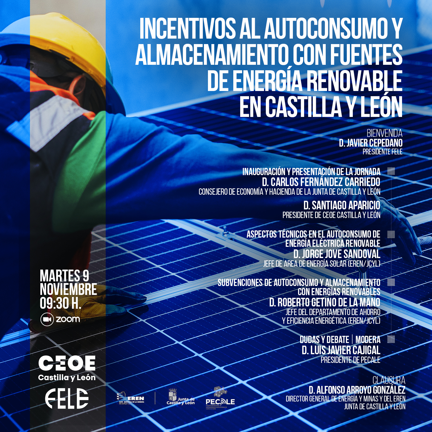 Con tal motivo, desde FELE, en colaboración con CEOE CASTILLA Y LEON, EREN (Ente Regional de la Energía de la Junta de Castilla y León), PECALE (Federación de Empresarios de Instalaciones de Castilla y León) han diseñado una jornada online de máxima actualidad sobre una las líneas de acción fundamentales de el Plan de Recuperación para Europa "Next Generation EU": el impulso y apoyo de las energías renovables.