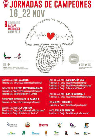 Las tapas finalistas al premio de Mejor Tapa Micológica Provincial son las elaboradas por el restaurante Alcores, el Parador Antonio Machado y hotel Villa de Almazán, con su tapas Ternera en teriyaki con boletus en texturas, Mico hot-dog al sarmiento con mostaza de rebozuelos y Ketchup de níscalos y Volcán de sabores. Fueron elegidas en una fase final en la que once establecimientos cocinaron sus tapas para el jurado de expertos reunido en la Escuela de Hostelería de Soria, CIFP La Merced.