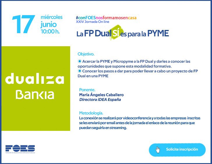 La jornada gratuita ‘La FP Dual sí es para la pyme’ se celebra el miércoles, 17 de junio, a las 10 horas. Los interesados deberán inscribirse en la web de la Federación (www.foes.es) y recibirán un enlace vía mail antes del inicio de la jornada donde podrán seguirla vía streaming.