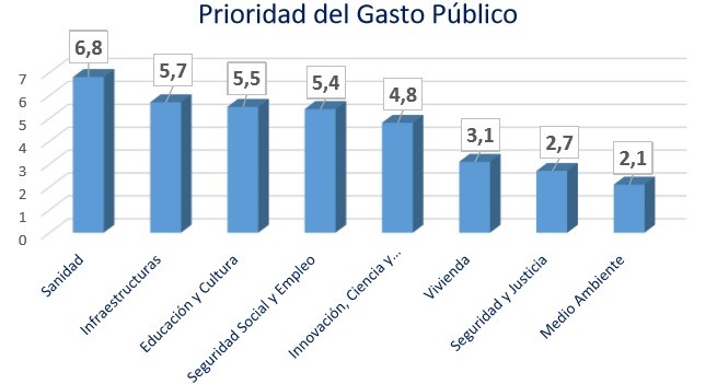Al pedir a los economistas de Soria que ordenen en una escala de 1 a 8 el destino que darían al dinero público, estos profesionales según refleja el siguiente gráfico priorizarían la Sanidad (6,8), seguida por Infraestructuras (5,7), Educación y Cultura (5,5), Seguridad Social y Empleo (5,4), Innovación, Ciencia y Tecnología (4,8), Vivienda (3,1), Seguridad y Justicia (2,7) y, por último, Medio Ambiente (2,1).