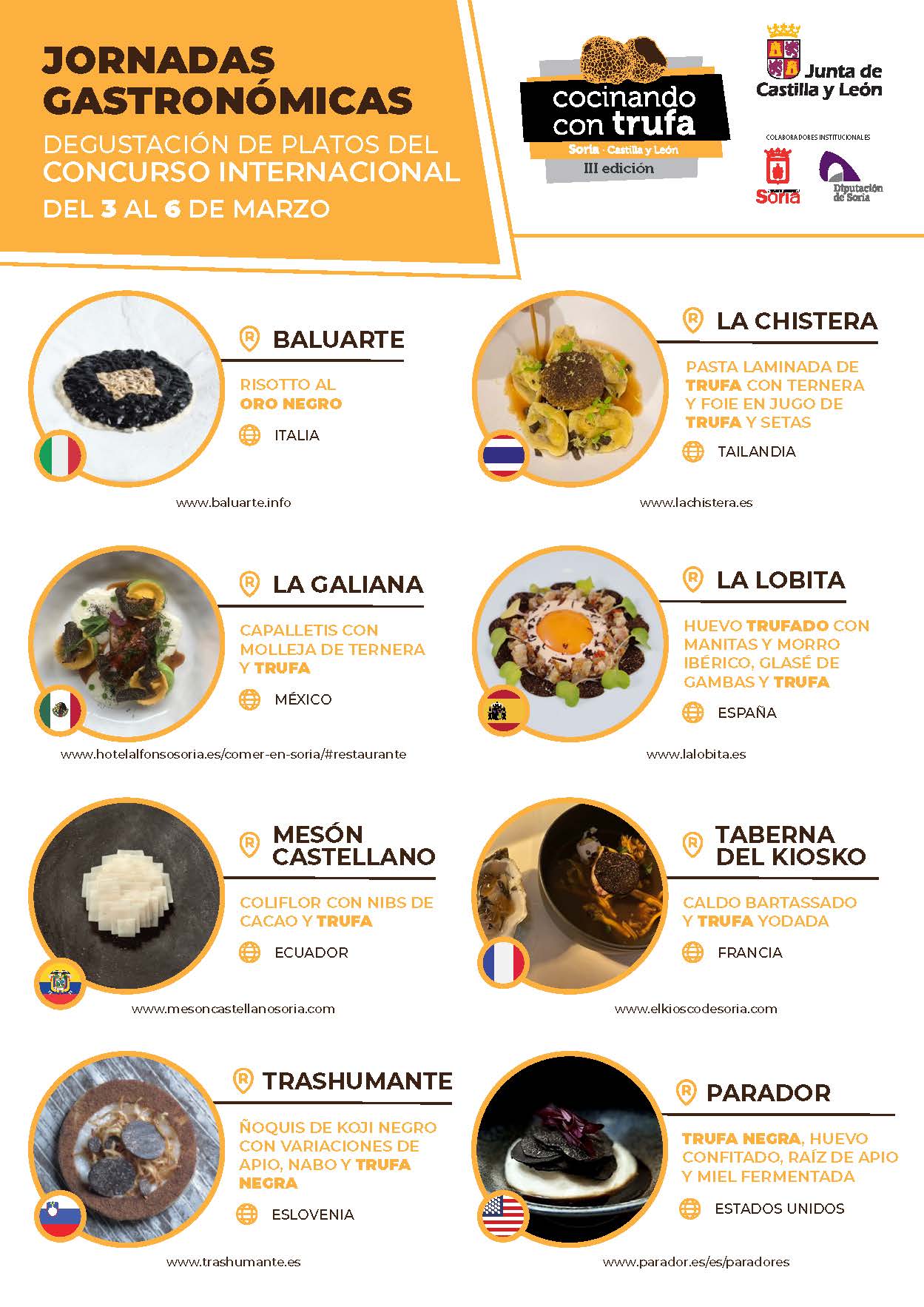 Ocho restaurantes de Soria, siete de la capital y uno de Navaleno, apadrinan desde hoy miércoles a los cocineros que compiten en la tercera edición del concurso internacional Cocinando con Trufa, organizado por la Junta de Castilla y León.