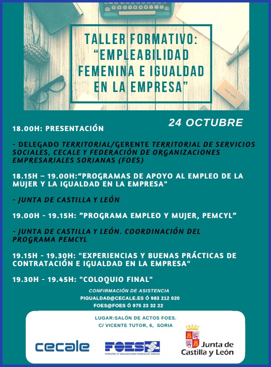 De acuerdo con el compromiso adquirido para la promoción de acciones en materia de igualdad de oportunidades entre mujeres y hombres y prevención de la violencia de género, la Confederación de Organizaciones Empresariales de Castilla y León (CECALE) ha organizado en colaboración con la Federación de Organizaciones Empresariales Sorianas (FOES), un taller formativo, que bajo el título “Empleabilidad Femenina e Igualdad en la Empresa” se celebrará mañana martes día 24 de octubre, a las 18.00 horas.