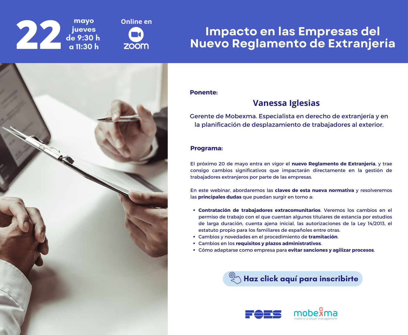 PonenteVanessa Iglesias | Gerente de Mobexma. Especialista en derecho de extranjería y en la planificación de desplazamiento de trabajadores al exterior.