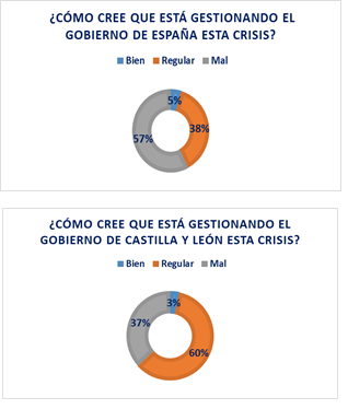 Estos porcentajes se invierten cuando responden sobre la gestión de la crisis por parte de la Junta de Castilla y León y mientras el 37% cree que la Administración regional lo ha hecho “mal”, el 60% considera que la gestión ha sido “regular”. Un 5% de los consultados cree que el Gobierno de España lo ha hecho “bien”, mientras que el porcentaje cae al 3% en el caso de la gestión del Gobierno Castellano y Leonés.